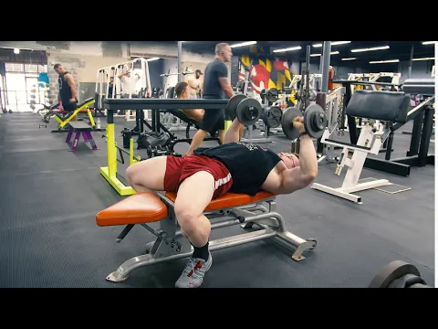 - Inhale. As you exhale, press the dumbbells straight up—they should be above your chest, not your face.